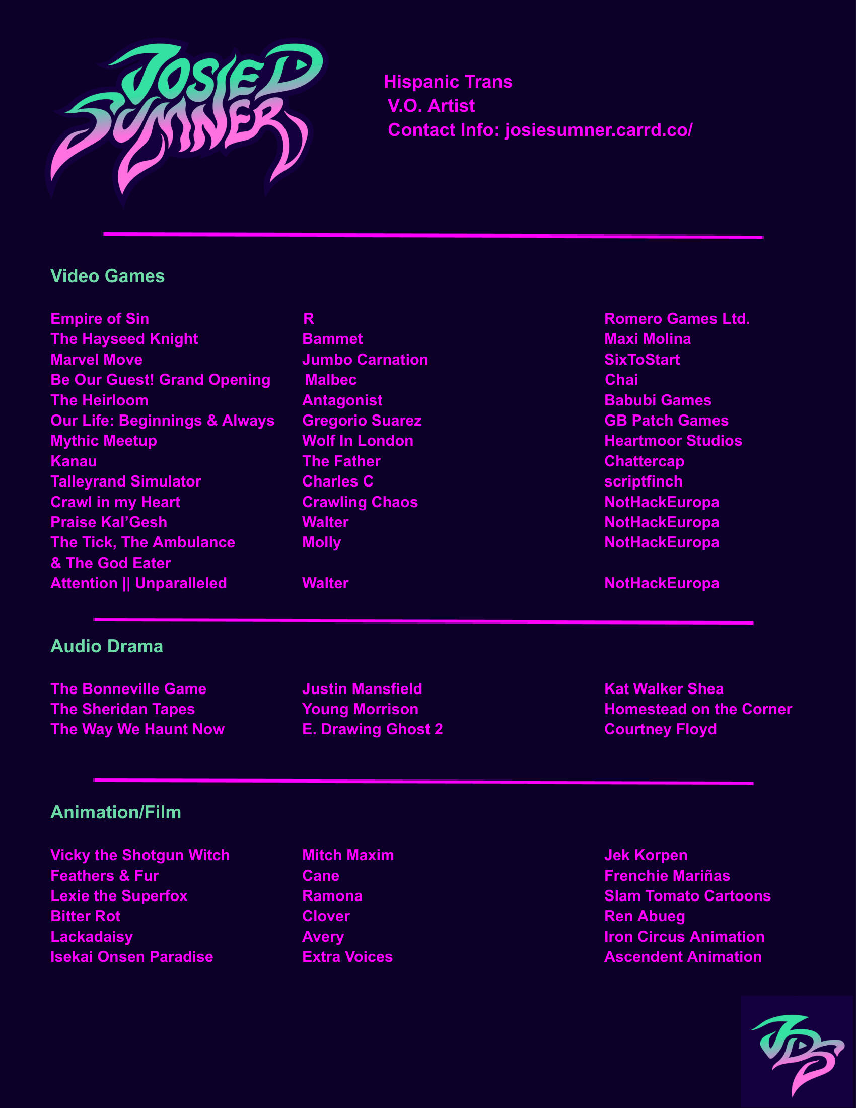 Josie "D" Sumner is a voice actress based in Tacoma, WA. She is known for her performances in Feathers & Fur (2025), The Hayseed Knight (2024) and Marvel Move (2023).