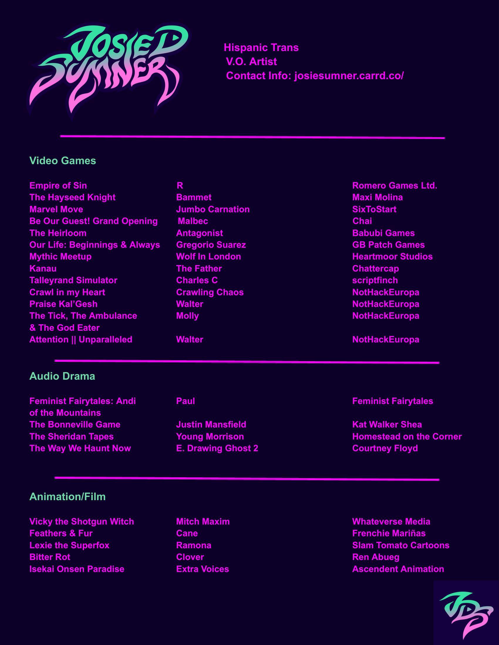 Josie "D" Sumner is a voice actress based in Tacoma, WA. She is known for her performances in Feathers & Fur (2025), The Hayseed Knight (2024) and Marvel Move (2023).